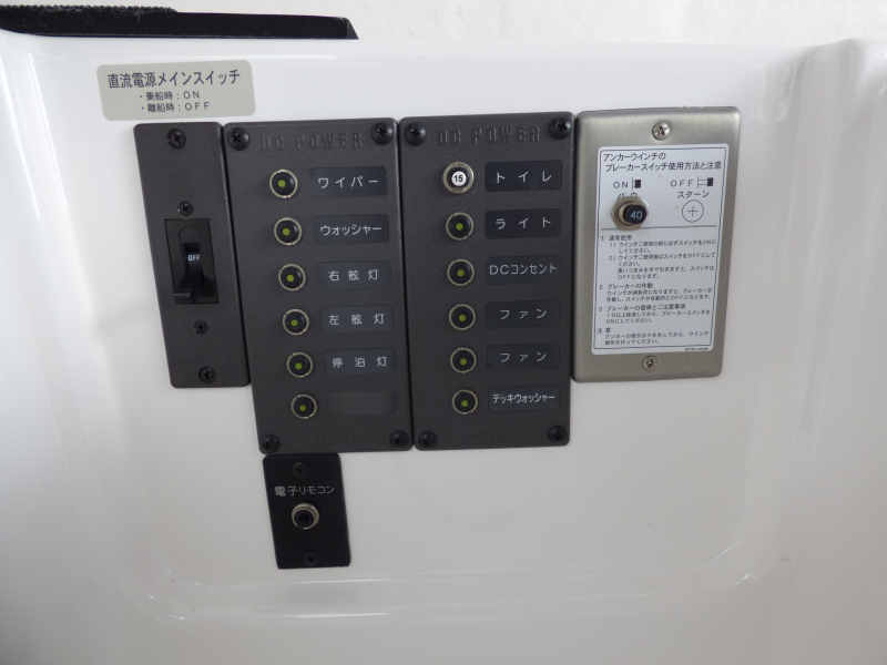 装備品装備品以外のオプション:コンセント(2個)、アフトGPS魚探モニター&スイングアーム、サーチライト、デッキライト、電動リール電源BOX(2個)、テレビアンテナ、フェンダーホルダー、清水タンク&蛇口